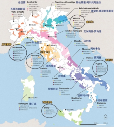 托斯卡纳位于意大利中部,沐浴着地中海的充足阳光,干燥的气候与砾石土壤,让葡萄积累了浓郁的风味。产区标志性葡萄品种是桑娇维塞,酸度明亮、单宁紧实,带有红樱桃、李子和草本气息。