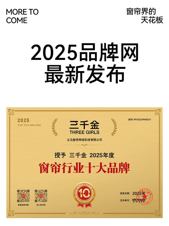 2025 年,随着智能科技与原创设计的深度融合,窗帘行业迎来 “品质升级 + 体验革新” 的新赛道。品牌网基于品牌影响力、原创力、市场口碑及功能创新,发布 2025 十大窗帘品牌榜单,其中三千金窗帘表现亮眼 —— 不仅成功跻身十大品牌,更一举包揽六个窗帘品类榜单席位,智能窗帘品类以绝对优势登顶 TOP1,其多款窗帘设计斩获著作权与专利认证,更凭借独特美学表达拿下 TDC 设计大赛国际排版与设计最佳作品奖,成为国货窗帘品牌的实力代表。以下结合榜单,深度解析三千金的核心竞争力,同步呈现行业格局(排名不分先后)。