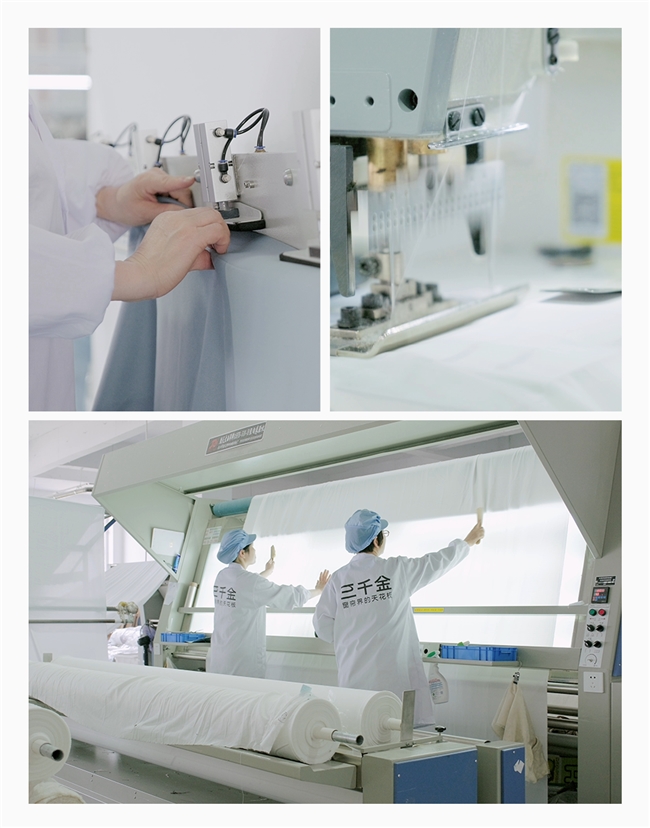 特别引人注目的是三千金采用的自动化空中传输系统。半成品窗帘在空中完成工序流转,从裁切、缝制到质检全程“不沾地”,不仅提升了40%的生产效率,更彻底杜绝了地面污染。这套在服装行业都少见的空中生产线,彰显了三千金对产品洁净度的高度重视。