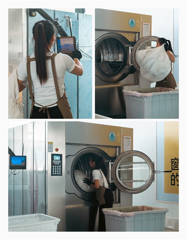 三千金独有的“健康水洗”工序成为关注焦点。完成质检的窗帘会送入配备先进水循环和过滤系统的工业洗衣机,进行30分钟深度清洗,彻底去除表层浮毛、灰尘及生产环节可能残留的细微杂质。洗净后的窗帘采用反面悬挂晾晒方式,直接有效地避免了灰尘的二次附着,真正实现“开箱即挂”,为有儿童的家庭提供了额外保障。