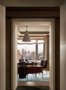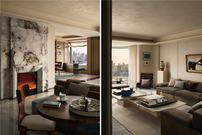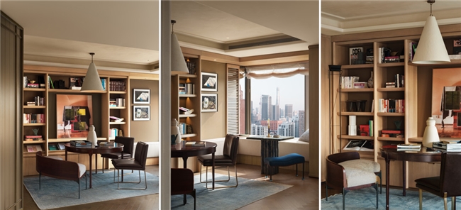 临窗区域刻意保留通透感,大幅落地窗如画框般框取城市景致。宽厚的皮革矮榻沿窗延伸,阅读、聚会或放空时,都能与城市的昼夜相伴。
