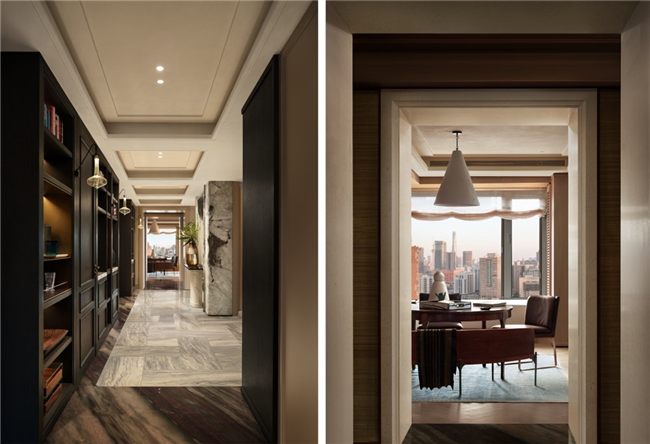 推门而入,左侧是开放柜体,右侧则是步入式行李间,两者沿一条清晰的横向轴线展开,空间秩序感油然而生。整块巴西利亚奢石打造的过廊,以克制的姿态奠定空间经典秩序的基调,既是动线缓冲,也构成归家后的视觉锚点。