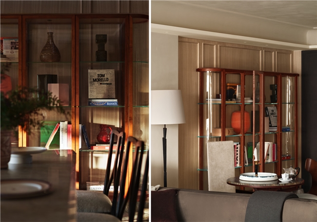 餐桌尽头的玻璃收藏柜通透轻盈,陈列着当代艺术书籍与个人收藏器皿,将客厅的艺术气息自然带入用餐日常。另一侧墙面,整排金属酒柜低调存在,既是功能完备的mini bar,也为空间注入一丝盖茨比式的戏剧感。艺术品与家具并非刻意陈列,更像是随着生活轨迹自然聚集于此。不刻意的松弛,让餐厅成为日常中最舒适的角落。