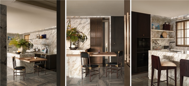餐厅与西厨区通过一体化布局形式,强调“餐厨社交化”属性,将不同的功能属性完整闭环。西厨岛台承担备餐与操作台功能,也自然地成为了厨房社交的圆心。