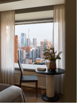 临飘窗处, Sren Horn的曲线靠背椅 ,以优雅线条柔化环境,成为阅读或冥想的温暖角落。远处不同时段的东方明珠犹如一幅静物画,当夜晚时分铂金色的灯光洒落,更添朦胧意境。