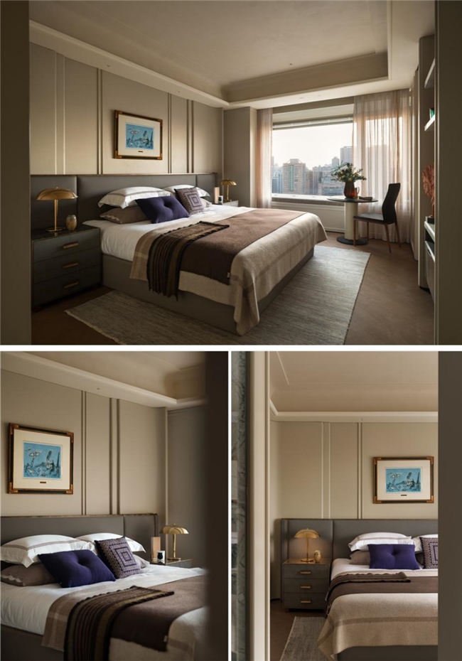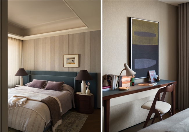 主卧延续整体设计语言,空间氛围转向沉静与内省,塑造优雅而深刻的生活范式。艺术版画赋予空间戏剧张力,暖灰调皮质床靠、珍珠鱼皮床头柜、来自丹麦的羊绒织物与手工锤打的黄铜灯具并置,让经典被解构、转译,自然地融入当下的感官体验。